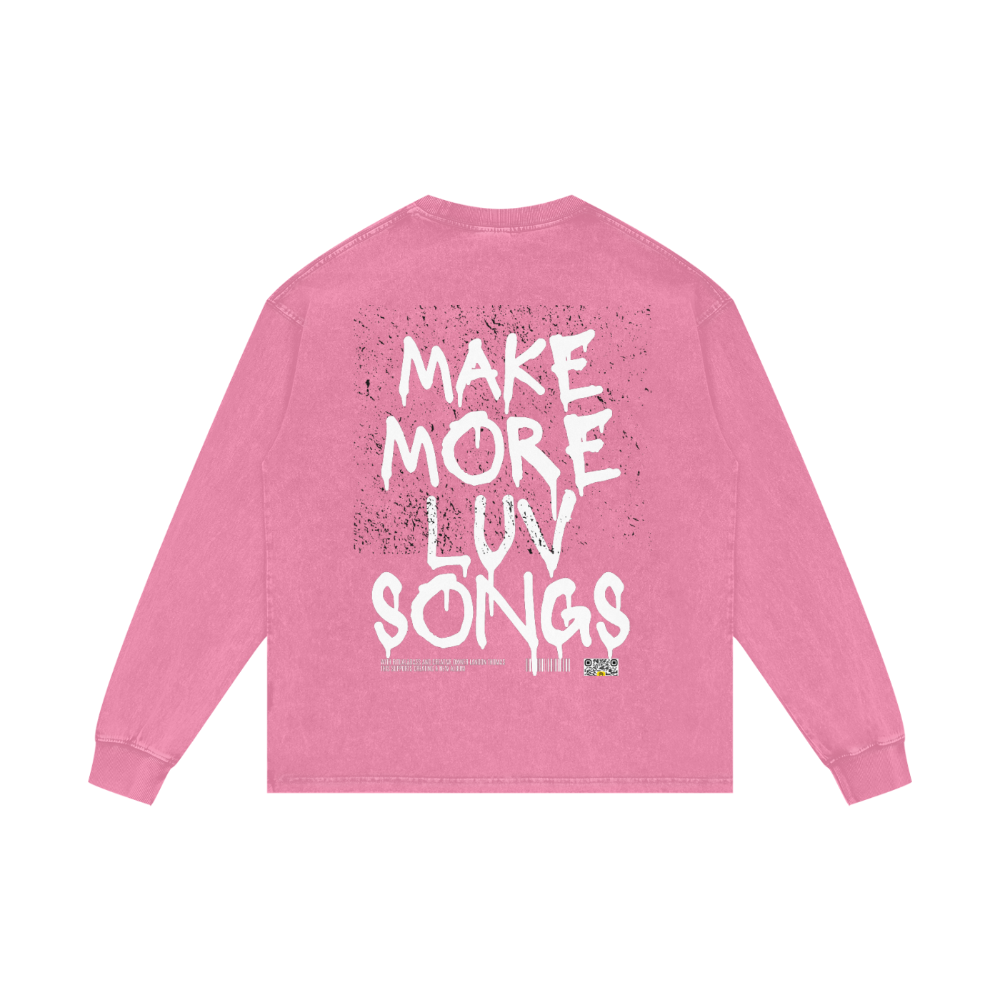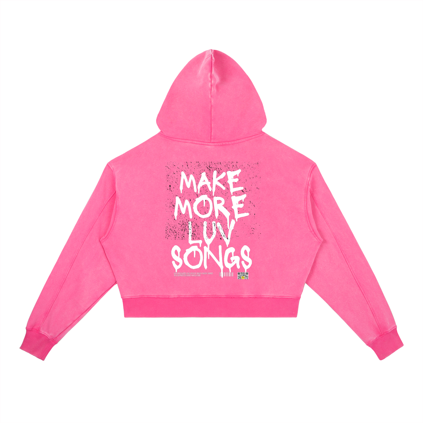 The back delivers the message boldly, "MAKE MORE LUV SONGS" in expressive, hand-painted lettering layered over a textured, distressed backdrop, turning the hoodie into a wearable manifesto. Finished with a relaxed cropped fit, ribbed cuffs and hem, and a structured hood, it balances softness with intention.