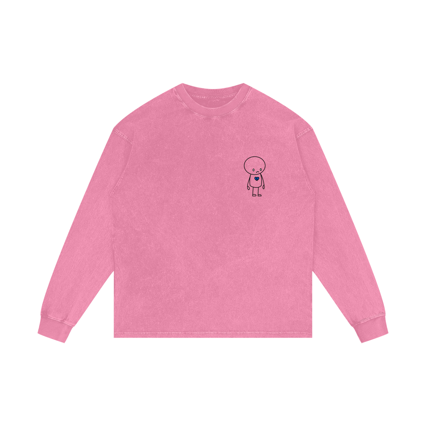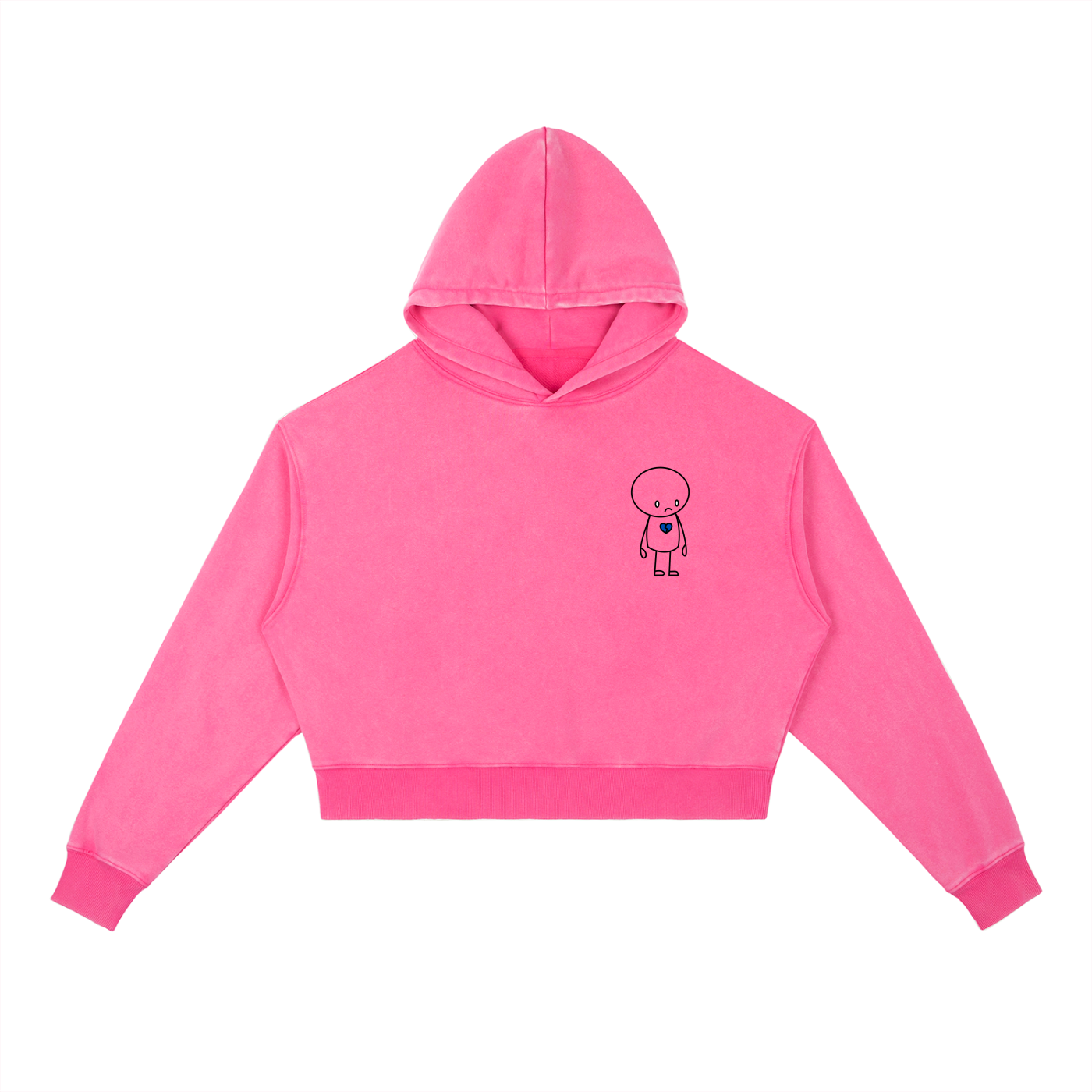 A soft statement piece built for comfort and feeling. This cropped pink hoodie features a vintage-washed finish that gives it a lived-in, cozy look with modern edge. On the front, a minimalist line-drawn character with a blue heart adds a subtle, intimate detail: quiet, reflective, and personal.